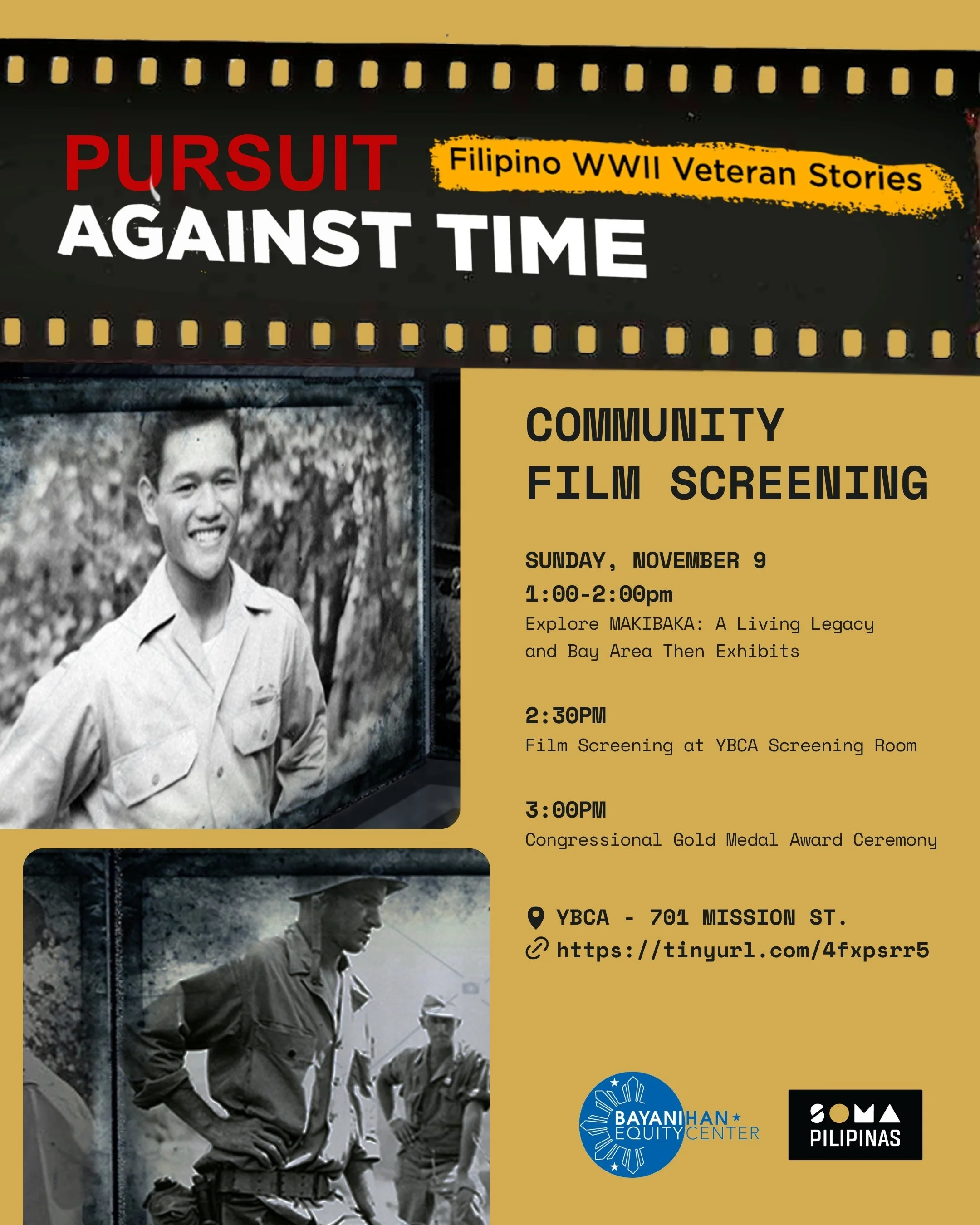 "Pursuit Against Time: Filipino WWII Veteran Stories" is a short documentary film produced by the Bayanihan Equity Center that captures the stories of struggle endured by Filipino WWII Veterans in America, and highlights the pursuit of these veterans and their advocates for full recognition and equity.